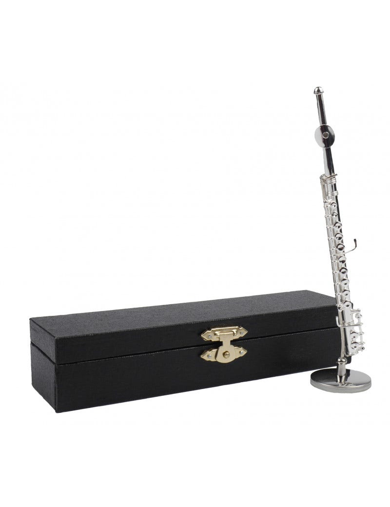 Modellino in miniatura rappresentante un flauto traverso con supporto e custodia.
