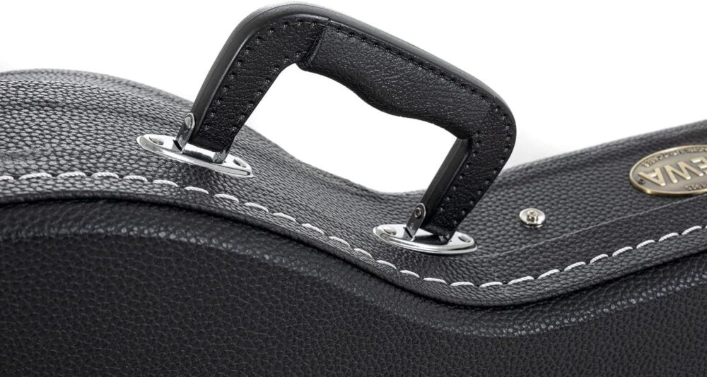 Questo astuccio per mandolino bombato di Gewa è un modello con struttura in legno e un coperchio robusto e piatto.