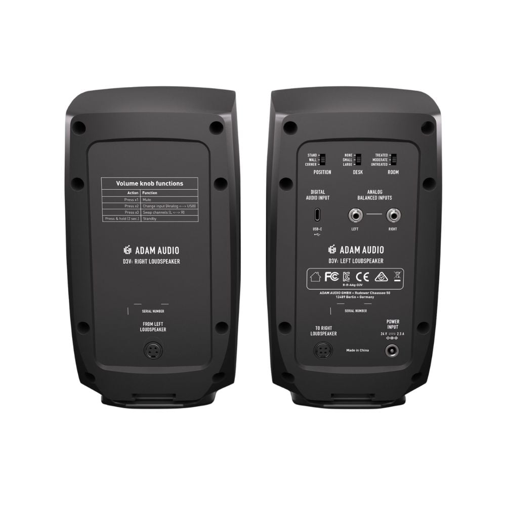 I monitor ADAM Audio D3V sono progettati per offrire prestazioni audio eccellenti in un design compatto, ideale per compositori, produttori e amanti della musica. Dotati di un ingresso USB-C per il collegamento diretto a computer e dispositivi mobili, i D3V offrono un suono cristallino senza necessità di un’interfaccia audio esterna. Il woofer in alluminio da 3,5″ e il tweeter D-ART assicurano una riproduzione precisa, mentre i radiatori passivi estendono la risposta in frequenza.