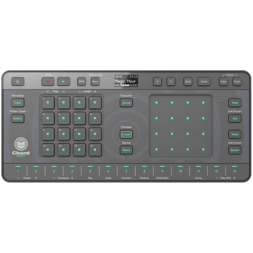 AlphaTheta Chordcat è una groovebox portatile a 8 tracce progettata per aiutare musicisti e producer a creare facilmente progressioni di accordi, melodie e ritmi. Offre 145 suoni strumentali, 16 kit di batteria, funzioni avanzate di arrangiamento, un sequencer integrato, effetti manipolabili in tempo reale e un innovativo sistema chiamato Chord Cruiser che suggerisce combinazioni di accordi compatibili. Alimentabile via USB-C o a batterie, è perfetta per comporre ovunque, in studio o in viaggio. Dispone di connettività MIDI e USB per l’integrazione con synth esterni e DAW.
