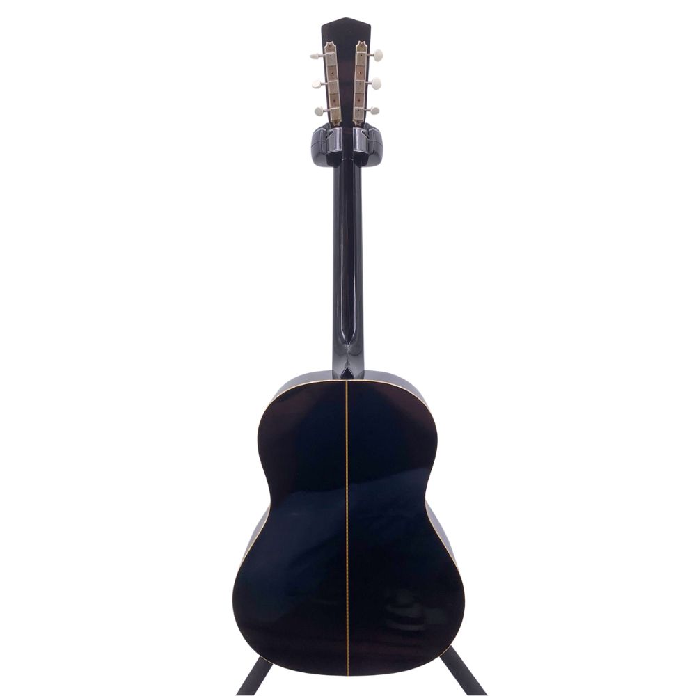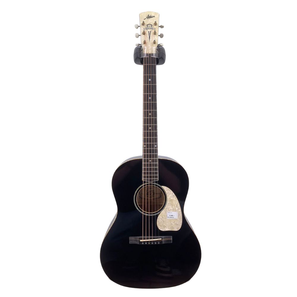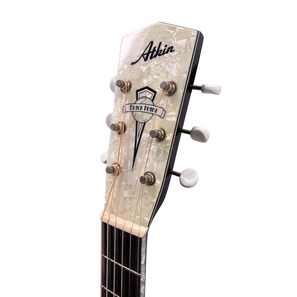 Baked Sitka Spruce top – Mahogany Back & Sides – Mahogany Neck – Santos Rosewood Fretboard – Santos Rosewood Bridge – Pre-war scalloped Bracing – Aged Nitro Cellulose Ebony Finish with perloid binding, pickguard and headstock – Bone Nut & Saddle – Nickel Kluson Tuner – Nut Width 1 11/16″ – Scale Length 24 7/8″ – Atkin Hard Shell