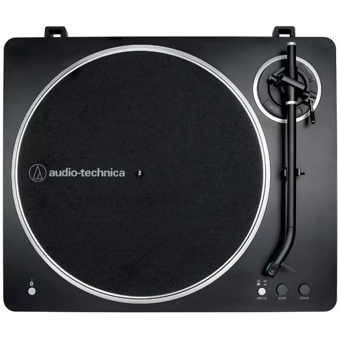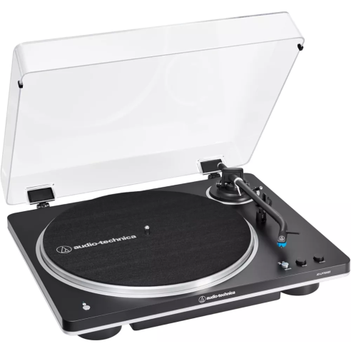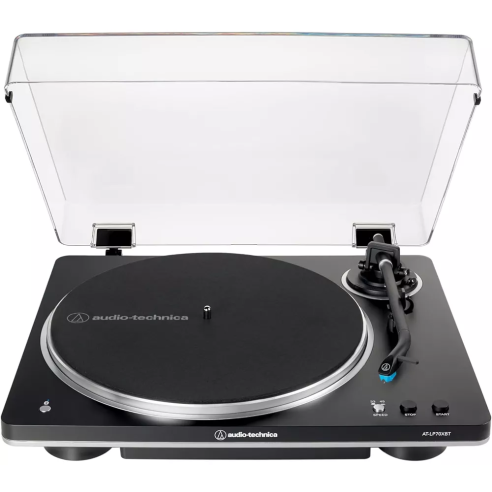 AUDIO TECHNICA AT-LP70XBTBS è un giradischi automatico con trazione a cinghia, connettività Bluetooth e uscita USB. Le caratteristiche tecniche includono 2 velocità selezionabili 33/45 giri, preamplificatore phono integrato, piatto girevole in alluminio pressofuso, testina premontata AT-VM95C Dual Moving Magnet con stilo conico da 0.6 mm, connettività Bluetooth 5.2 con codec Qualcomm aptX Adaptive audio, uscita phono tramite connettori RCA L/R e bus USB. Include coperchio antipolvere, tappetino in feltro, adattatore per 45 giri, cavo RCA (1 m), adattatore AC (1.5 m)