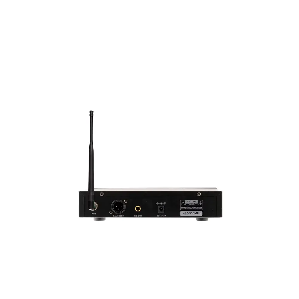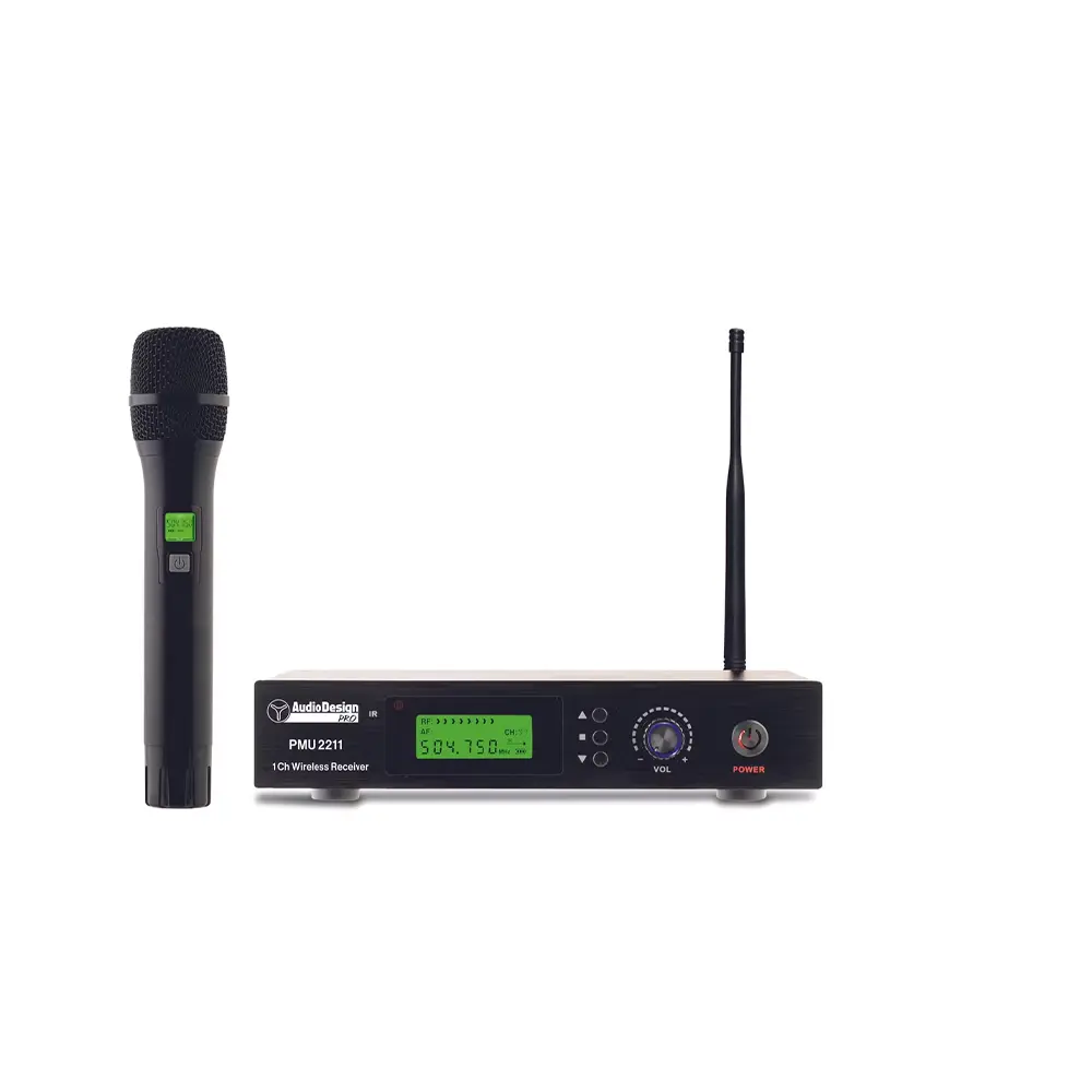 AUDIODESIGN PMU 2211 RADIO A MANO. Sistema Wireless UHF 1 canale costituito da ricevitore e trasmettitore palmare. Le caratteristiche tecniche includono 100 frequenze selezionabili da 480,000 a 504,750 MHz, sincro ricevitore/microfono tramite IR, funzione Auto Scan. Radiomicrofono palmare a pattern polare cardioide con display e indicatore stato batteria, alimentazione tramite 2 batterie AA, volume di uscita regolabile, uscite XLR e Jack.