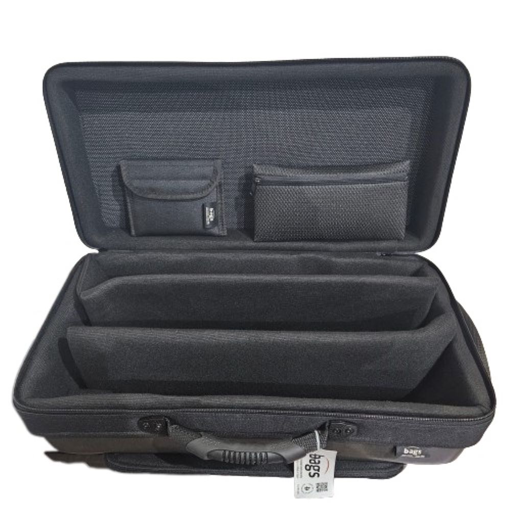 All’interno presenta due scomparti chiusi, uno per il sordino dritto e uno per due bocchini dritti.