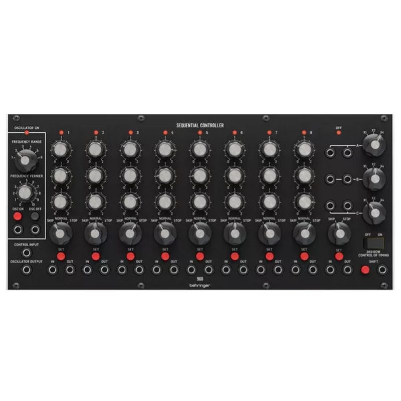 Il Behringer 960 Sequencer Controller è una riproduzione autentica dei circuiti della serie ‘Modular 55′ utilizzata dai musicisti pop, rock e jazz più famosi al mondo. Ora puoi costruire il tuo sintetizzatore unico e personale che può stare in una custodia Eurorack standard ad un prezzo molto conveniente. Abbina moduli specifici per personalizzare il tuo synth e completare il genere di musica che suoni, oppure riempi la stanza sino al soffitto con moduli che soddisferanno i sogni più sfrenati di ogni fanatico del synth. Il 960 Sequencer Controller è un sequencer a 8-step con 3 file di controlli CV per regolare il pitch di un segnale in quello stadio. Un ulteriore 9° step può essere utilizzato per interrompere la sequenza. Collega un Behringer 962 Sequential Switch e trasforma il 960 in un gigante a 24-step in grado di creare sequenze e ritmi più intricati.