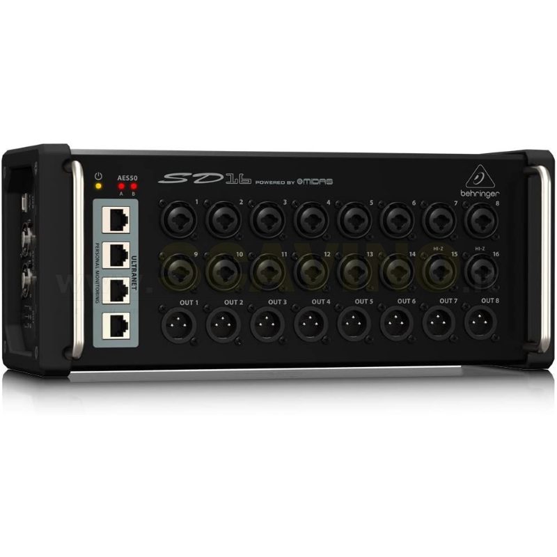 Il mixaggio digitale ha rivoluzionato praticamente tutto nella produzione del live-entertainment. Ora Behringer offre la soluzione perfetta per collegare i talenti sul palco con la console Front of House (FOH), e il resto del mondo. L’SD16 fornisce 16 preamplificatori microfonici MIDAS controllabili da remoto, 8 XLR return analogiche bilanciate, oltre a un centro di distribuzione Ultranet a 4 porte integrato per il collegamento diretto al mixer per personal monitor Behringer P16-M – senza bisogno di hardware aggiuntivo. Inoltre, l’SD16 è estremamente compatto e dotato di robuste protezioni, in modo da poterlo mettere direttamente sul palco, ovunque ce ne sia bisogno. Ancora di più: tutto quello che serve è un singolo cavo Cat 5e per stage box. E se hai bisogno di più ingressi, o semplicemente vuoi mantenere corti e ordinati i cavi, mettendo un SD16 nella parte anteriore del palco ed un altro dietro il batterista, avrai ulteriori 16 ingressi per il microfonaggio della batteria e degli amplificatore per chitarra / basso.