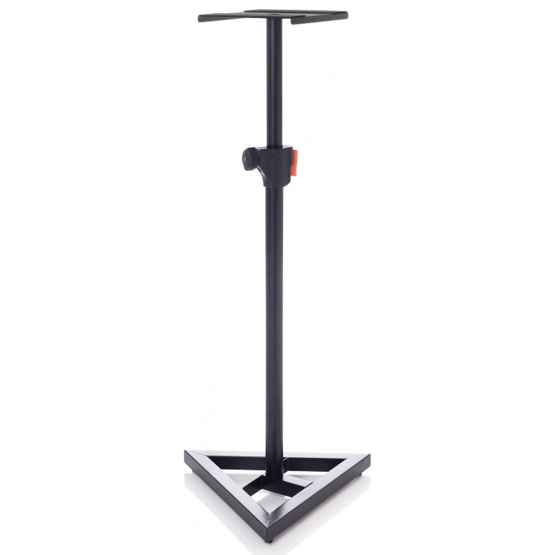 Supporto professionale in acciaio per monitor e casse. Ripiano di appoggio con protezione in gomma antiscivolo. Sistema di regolazione dell’altezza mediante pulsante automatico e manopola di sicurezza. Base triangolare con gamma di piedini intercambiabili per le diverse tipologie di pavimento Ripiano superiore 23×23 cm con gomma antiscivolo per garantire perfetta aderenza del monitor ed attenuazione delle vibrazioni. Base triangolare con lato 44 cm e kit di piedini intercambiabili