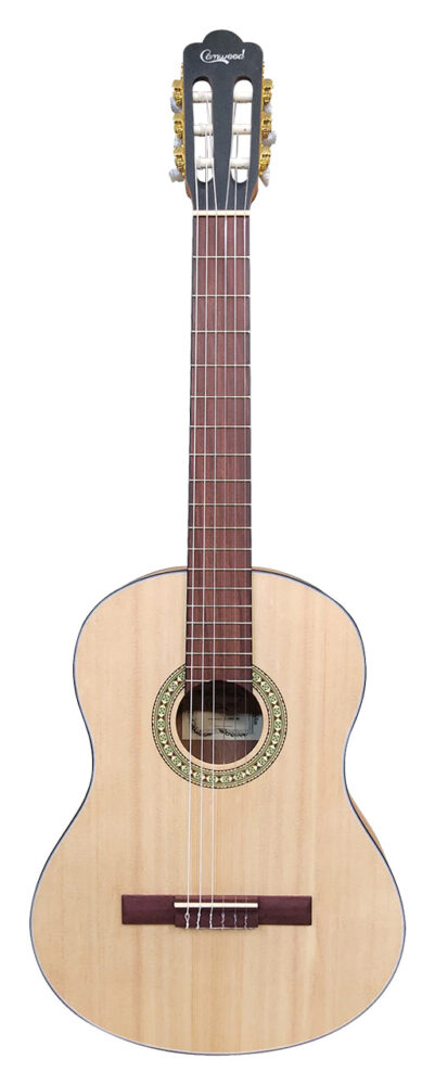 Chitarra classica 4/4 perfetta per gli studenti. Si parte dal top in Pino Himalayano abbinato a fondo e fasce in Mindi. Il manico in Meranti ha 19 Tasti e la paletta è in Kauri mentre la tastiera e il ponte sono in Palissandro Indonesiano.