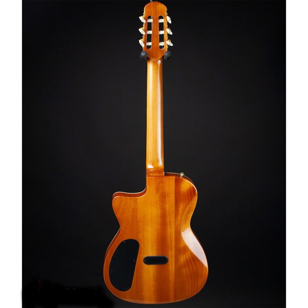 Chitarra classica solid body, con corde in nylon, progettata per unire l’eleganza del suono tradizionale a una struttura moderna e performante. E’ perfetta per la registrazione, il live occasionale, o busking, e il grande palco. Presenta un top in Acero fiammato impiallacciato, corpo e manico in Mogano con tastiera in Palissandro da 22 tasti. Ponte in Palissandro e meccaniche Dorate completano questo notevole strumento.