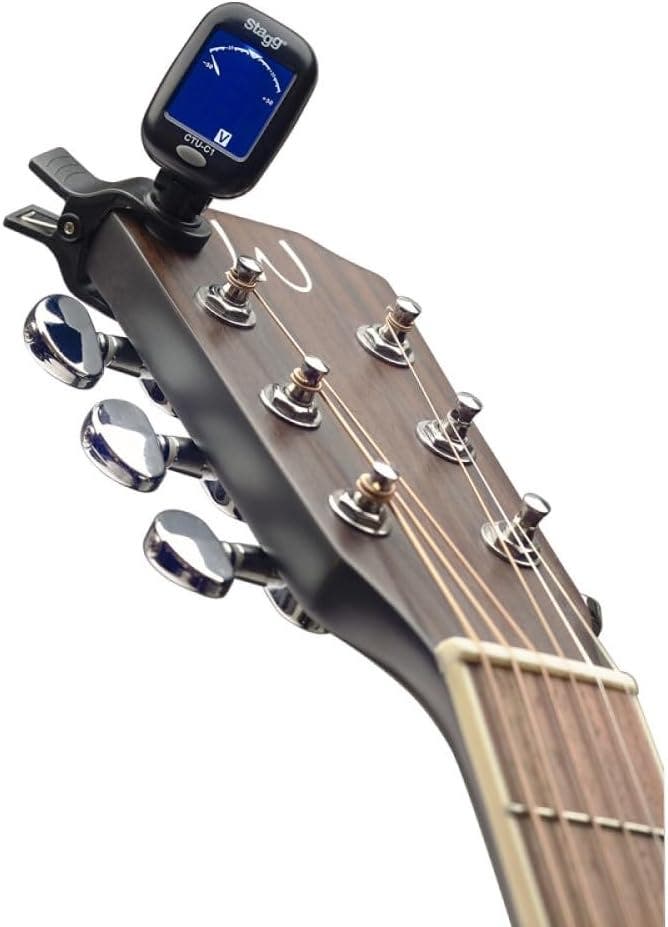 Stagg CTU C1 è un accordatore cromatico a pinza. È progettato per essere montato direttamente sulla testa della chitarra, del basso o di altri strumenti musicali. L’accordatore dispone di un display a LED che indica la nota rilevata e l’indicatore di accordatura. È dotato di una clip regolabile che permette di adattarlo a diverse dimensioni di testa. L’accordatore è alimentato da una batteria a bottone inclusa e offre una precisione di accordatura elevata. È facile da usare e garantisce un’accurata impostazione dell’accordatura degli strumenti musicali.
