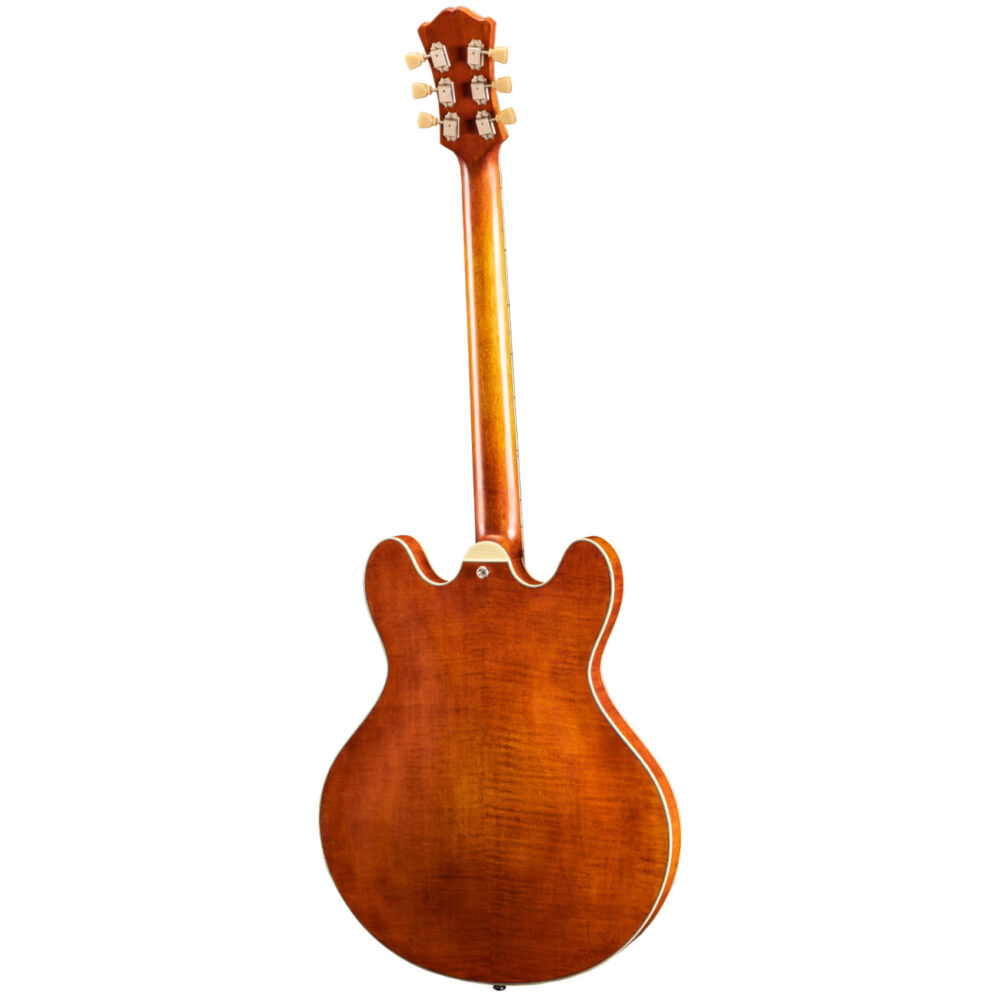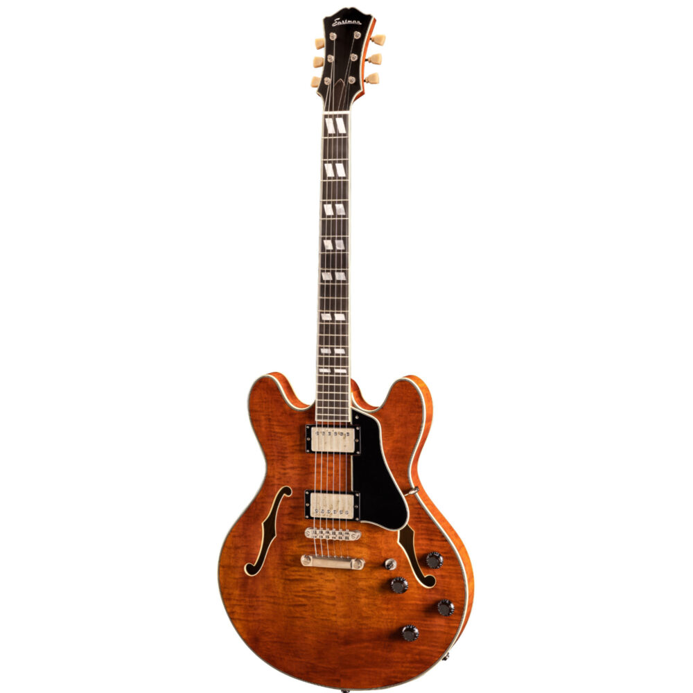 Chitarra semiacustica Eastman Truetone Vintage Gloss T59/TV con body realizzato in acero fiammato laminato, manico in acero ed una tastiera in ebano da 22 tasti Medium Jumbo con un radius di 12″. Coppia di pickup Seymour Duncan Antiquity Humbucker con selettore a tre posizioni switchcraft e potenziometri audiotaper. Ponte e meccaniche Gotoh finitura Relic. Custodia rigida inclusa.