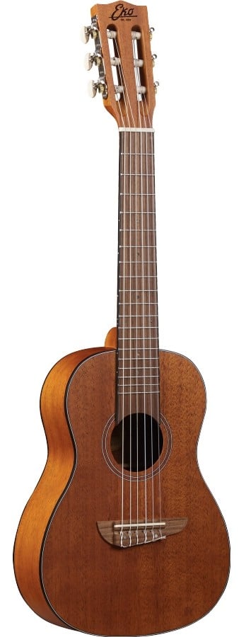 Uku Duo Guitalele è il guitalele, ovvero un ibrido tra una mini chitarra classica e un ukulele, della serie “Duo” di Eko Guitars. È realizzato con top, fasce e fondo in Mogano, manico in Okumè e tastiera 19 tasti in South American Roupanà. Con larghezza al capotasto di 45 mm, lunghezza della scala da 480 mm, si presenta in finitura satin open pore. Fornito con un accordatore a soffio, muta di corde di ricambio, prontuario di accordi e custodia in nylon, è uno strumento divertente, pratico e leggero, adatto al principiante ma anche al professionista. Il Guitalele fonde le classiche sei corde di una chitarra con la trasportabilità di un Ukulele. Solitamente questo strumento viene accordato in ADGCEA (dalla sesta corda alla prima), corrisponde quindi a una chitarra con il capotasto al V tasto. Questo strumento è perfetto come strumento da viaggio, oppure per avvicinare i bambini alla musica. Cercando di ampliare al massimo l’offerta di strumenti musicali, non poteva mancare nel catalogo Eko una sezione dedicata all’Ukulele, strumento comunemente associato alle Hawaii che fornisce all’ascoltatore una sensazione di relax e benessere.