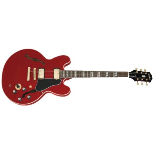 EPIPHONE ES-345 CHERRY è una chitarra elettrica semiacustica, serie ES-345 con corpo in acero laminato 5 strati con blocco centrale in acero, manico in mogano a profilo Rounded ”C”, tastiera in alloro indiano a raggio 12” con 22 tasti Medium Jumbo ed intarsi Pearloid Split Parallelogram, capotasto in Graph Tech, hardware Gold, meccaniche Epiphone Deluxe e ponte Locktone Tune-O-Matic con cordiera LockTone Stop Bar. L’elettronica a configurazione HH, consiste in 2 pickup humbucker Epiphone Alnico Classic PRO, con 2 controlli di Volume e Tono, selettore pickup a 3 vie e controllo rotativo Mono Varitone a 6 posizioni. Include Epiphone Premium Gig Bag