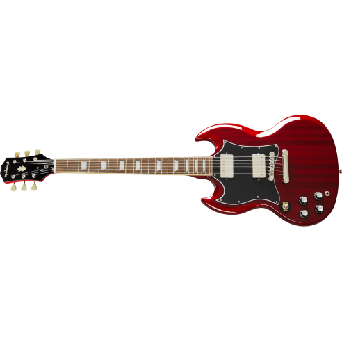 Chitarra Elettrica Epiphone SG Standard, mancina, colore Cherry. La Epiphone SG Standard mancina è una chitarra elettrica a 6 corde. Le caratteristiche tecniche comprendono: Manico in Mogano con profilo 60s SlimTaper, tastiera in Indian Laurel, raggio 12”, 22 tasti Medium Jumbo. Corpo in Mogano con battipenna ”Bat Wing” tristrato nero. L’elettronica consiste in due pickup Humbucker Epiphone Alnico Classic Pro, due controlli di Volume e due di Tono, selettore a tre posizioni. Hardware cromato, ponte Epiphone LockTone Tune-O-Matic, attaccacorde LockTone Stop Bar. Meccaniche Epiphone Deluxe. Bag inclusa