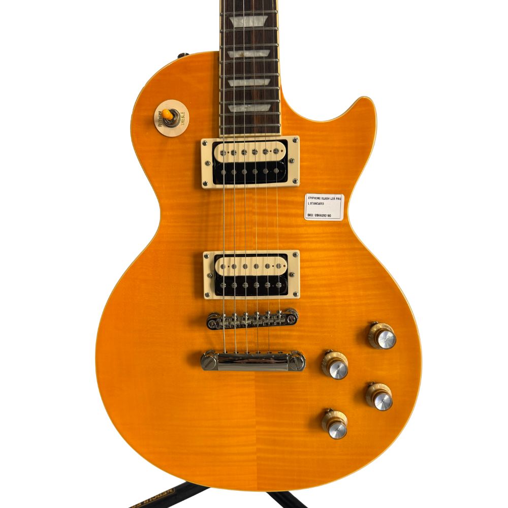 Made in PRC – 2021 – Appetite Burst – Mahogany Body annd Neck – Laurel Fretboard – 22 Medium Jumbo Frets – Slash Custom C Shap Neck Profile – Custom ProBucker Alnico 2 Bridge and Neck Pickup – 2 Volume, 2 Tone, CTS Potentiometers, Orange Drop Capacitors – LockTone Tune-O-Matic Bridge – Gold Top Hats with Metal Inserts and Dial Pointers Control Knobs – Epiphone Vintage Deluxe Tuners – Original Hard Case