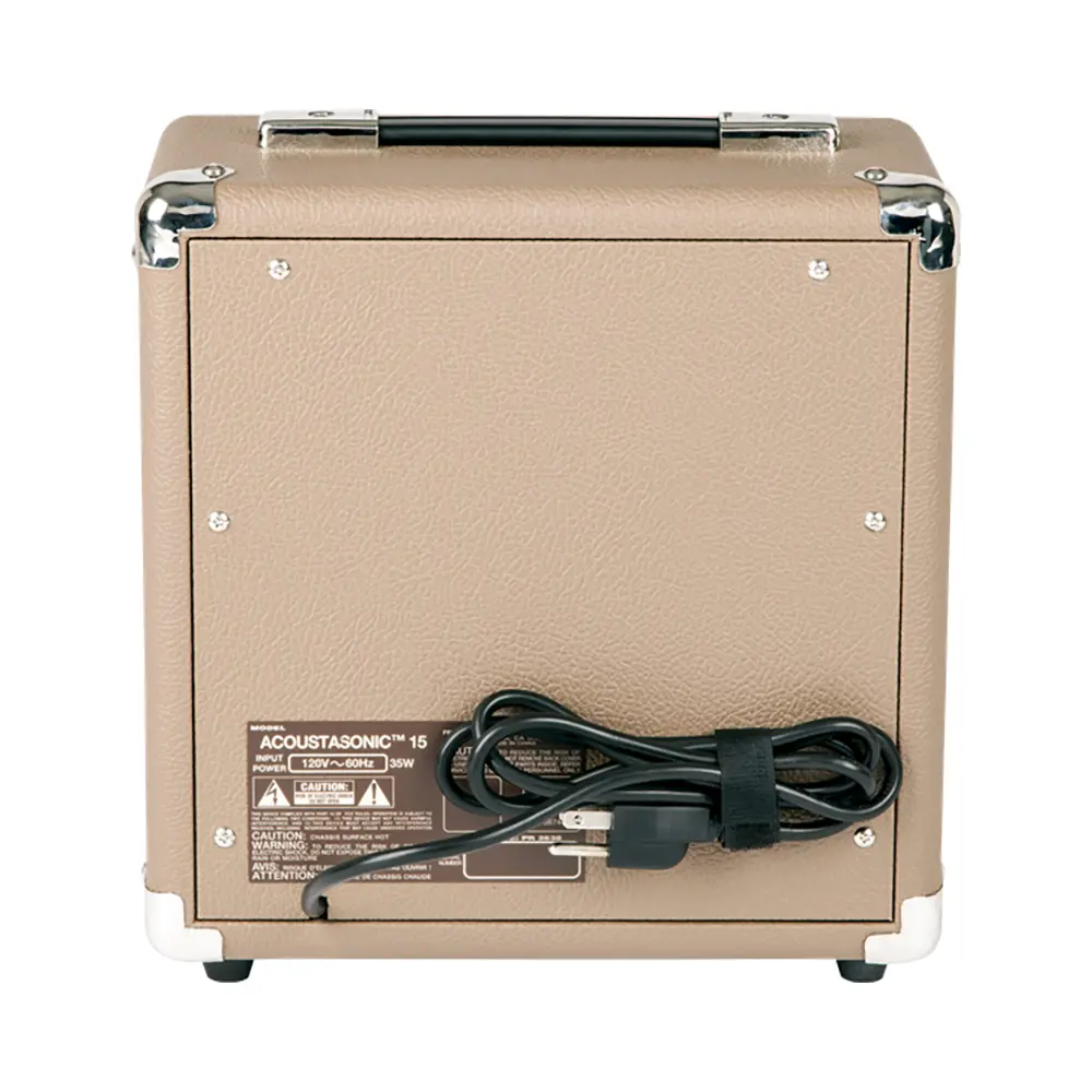 Per l’artista acustico che va ovunque e che ha bisogno di una comodità ultracompatta in un attimo, l’Acoustasonic 15 è l’amplificatore giusto con il suono giusto. Perfettamente trasportabile, offre un suono e funzioni eccezionali per una chitarra acustica ed un microfono – semplicità e flessibilità ideali per molteplici usi musicali ed in piccoli concerti e raduni. Per una risposta più efficace sulle alte frequenze, l’Acoustasonic 15 presenta l’insolita caratteristica di essere l’unico ampli per chitarra Fender a utilizzare un cono “whizzer”, un piccolo altoparlante supplementare fissato alla bobina dell’altoparlante da 6″ dell’amplificatore. Per un’ulteriore profondità e brillantezza dell’ambiente, il canale degli strumenti dell’Acoustasonic 15 è dotato di un effetto chorus integrato. Il comodo doppio ingresso sul pannello anteriore comprende un jack standard da 1/4″ per uno strumento ed un ingresso XLR per un microfono.