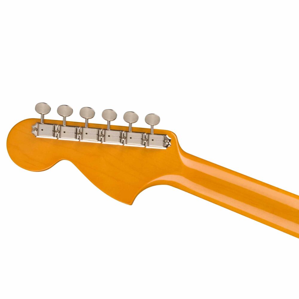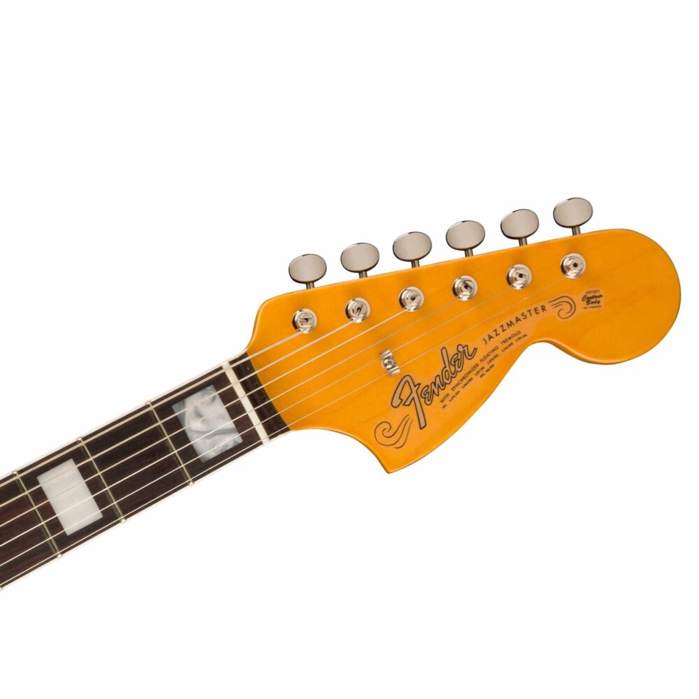 Chitarra elettrica Fender American Vintage II 1966 Jazzmaster® finitura 3 color Sunburst Body in ontano finitura gloss in nitrocellulosa, manico in acero profilo 1966 C, tastiera in palissandro con 21 tasti vintage tall ed un radius di 7.25″. Coppia di pickup Pure Vintage ’66 Single-Coil Jazzmaster® cablati per creare gli inconfondibili circuiti rhythm e lead, ponte Pure Vintage Jazzmaster® e meccaniche Pure Vintage Single Line “Fender Deluxe”.