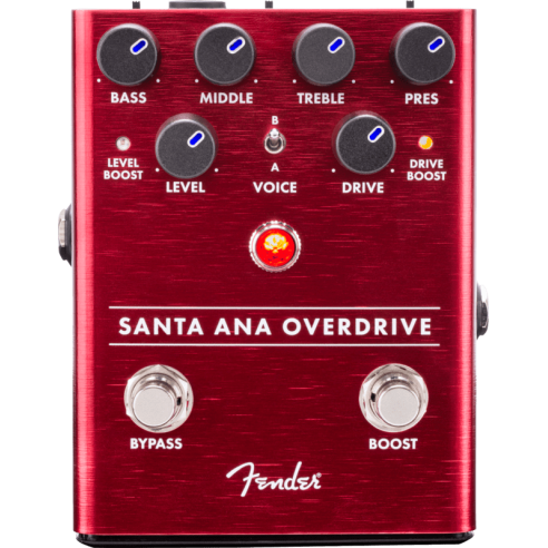 FENDER SANTA ANA OVERDRIVE è un effetto Overdrive a pedale per chitarra con tecnologia FET per emulazione valvolare, manopole retroilluminate a LED, equalizzatore a 3 bande Bass/Middle/Treble, controlli Pres/Level/Drive, switch per la selezione di 2 timbri di Overdrive A/B e LED di attivazione per Level Boost e Drive Boost. Presenza switch sul retro per attivazione della retroilluminazione LED sulle manopole On/Off, switch di selezione Bypass True/Buffered e switch di selezione funzione Level/Drive. Funziona con batteria da 9V o con alimentatore esterno (non incluso).