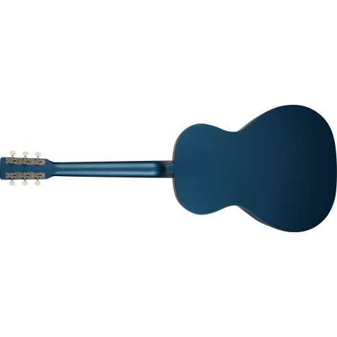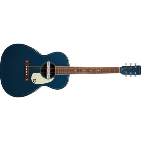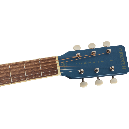 GRETSCH LTD DELTOLUX CONCERT DARK DENIM TOP è una chitarra acustica elettrificata formato Concert, modello Limited Edition Deltoluxe, con top, fondo e fasce in Sapele laminato a finitura Semi-Gloss, manico in Nato a profilo ”C”, paletta 1950’s Gretsch 3×3, tastiera in Noce a raggio 12” con 20 tasti Vintage e intarsi White Pearloid Dot, capotasto in osso sintetico, hardware nickel, Truss Rod Single Action, meccaniche pressofuse Open Gear 3+3 e ponte in noce con selletta in compensato. L’elettronica consiste in un pickup da buca magnetico Gretsch Deltoluxe Soundhole Pickup.