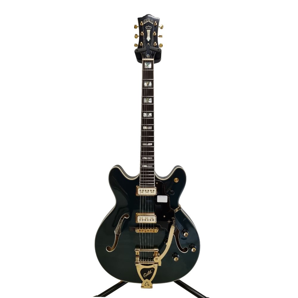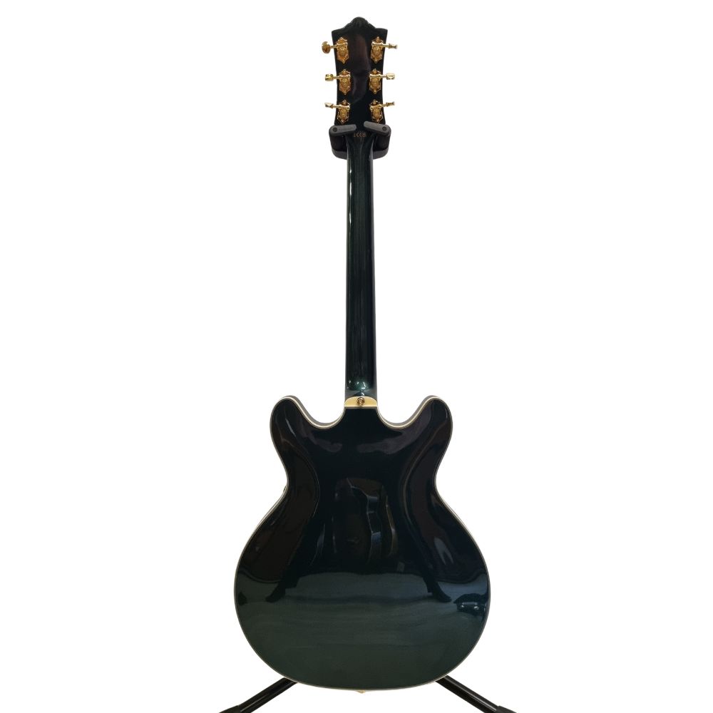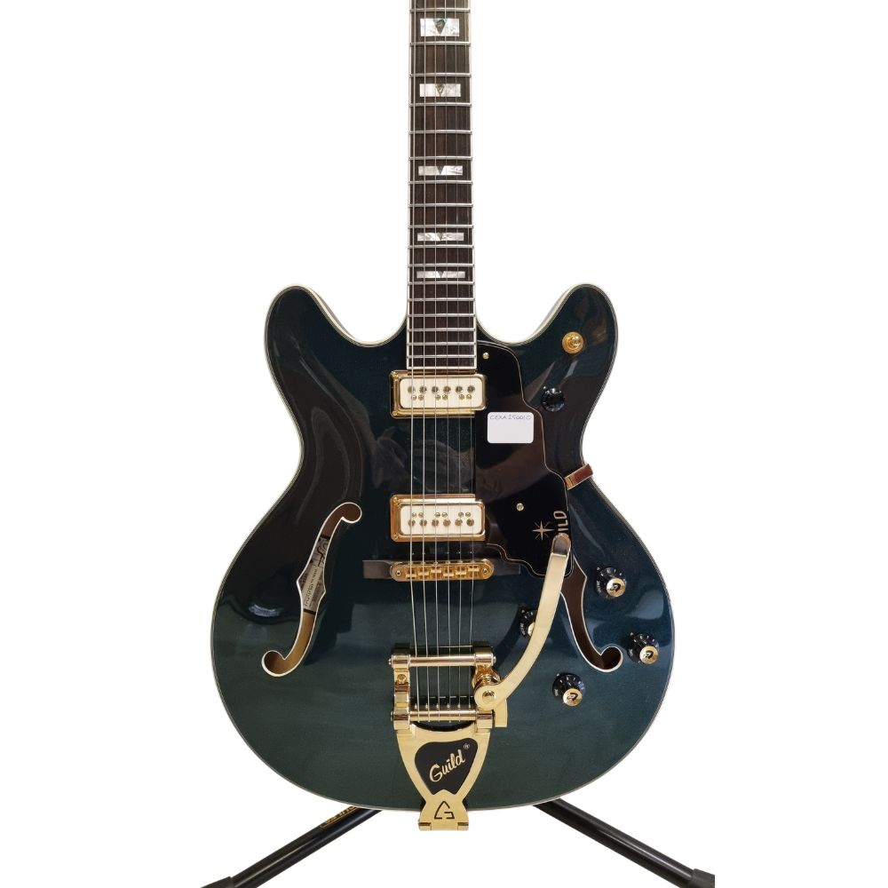 Made in Korea – 2013 – Kingswood Green – Maple top, back and sides -Spruce center block – Mahogany neck – Ebony fingerboard – 22 frets – 628 mm scale – Nut width 43 mm – MOP inlays – 2 Dearmond Dynasonic single coils – 1 master volume – 2 volume – 2 tone – 3-way – Guild Tune-O-Matic bridge with vibrato tailpiece – Gold hardware – Original Hard Case