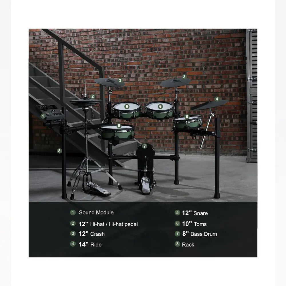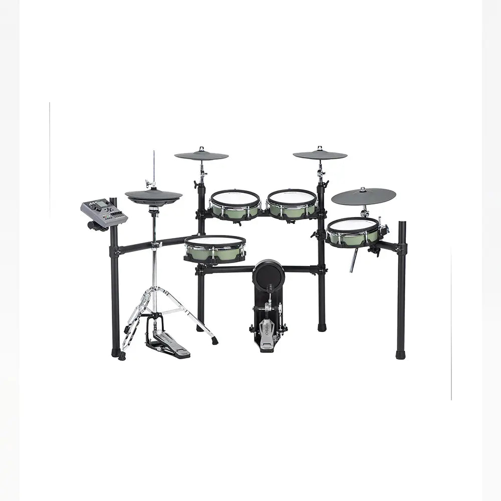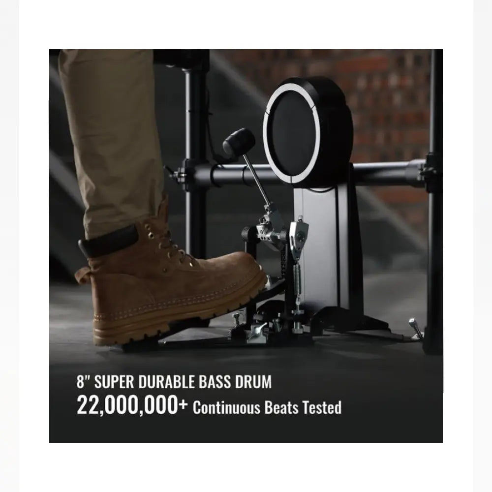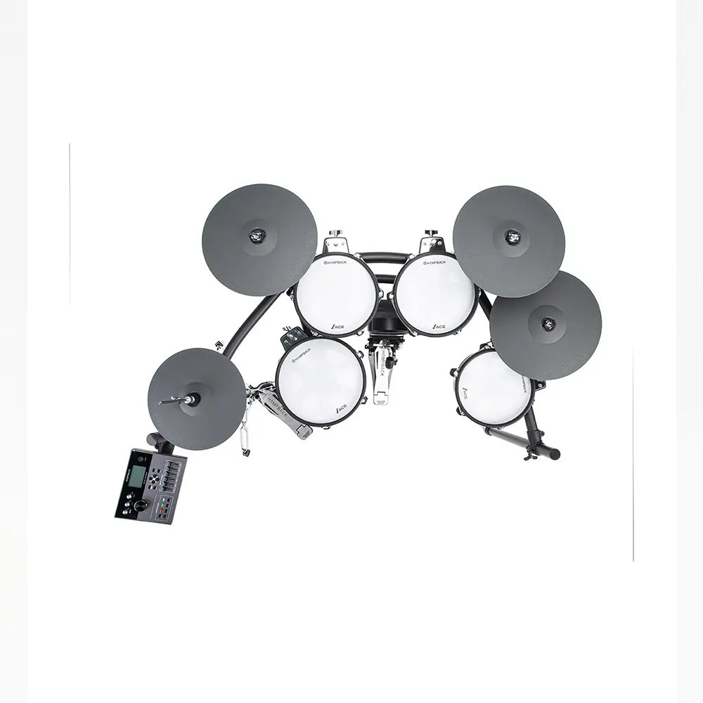 La grancassa è realizzata con un materiale speciale, resistente a oltre 22 milioni di colpi, mentre i pad per batteria, progettati a doppio strato, forniscono un feedback percussivo eccezionale. I piatti, compresi 2 crash e un ride a tre zone, offrono zone di impatto a 360°, incrementando la versatilità.