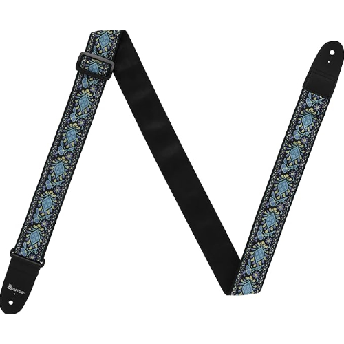 Ibanez GSV50-P1 è una tracolla Vintage Style in cotone e poliestere con ricamo floreale e terminali in pelle con logo Ibanez, adatta a chitarra e basso.