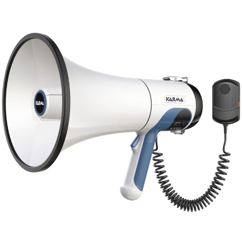 KARMA GT 1232BT è un Megafono 40W ricaricabile in grado di amplificare la voce rendendola udibile ad una distanza di oltre 1 Km. È alimentato da una batteria ricaricabile al litio da 11,1V – 2200mAh ma all’occorrenza è possibile utilizzare anche normali batterie di tipo C.