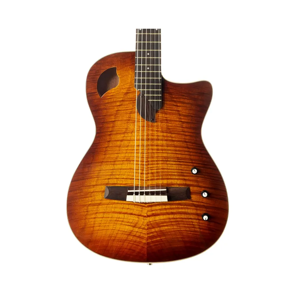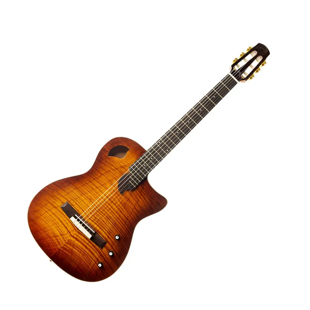 Chitarra classica solid body, con corde in nylon, progettata per unire l’eleganza del suono tradizionale a una struttura moderna e performante. E’ perfetta per la registrazione, il live occasionale, o busking, e il grande palco. Presenta un top in Acero fiammato impiallacciato, corpo e manico in Mogano con tastiera in Palissandro da 22 tasti. Ponte in Palissandro e meccaniche Dorate completano questo notevole strumento.