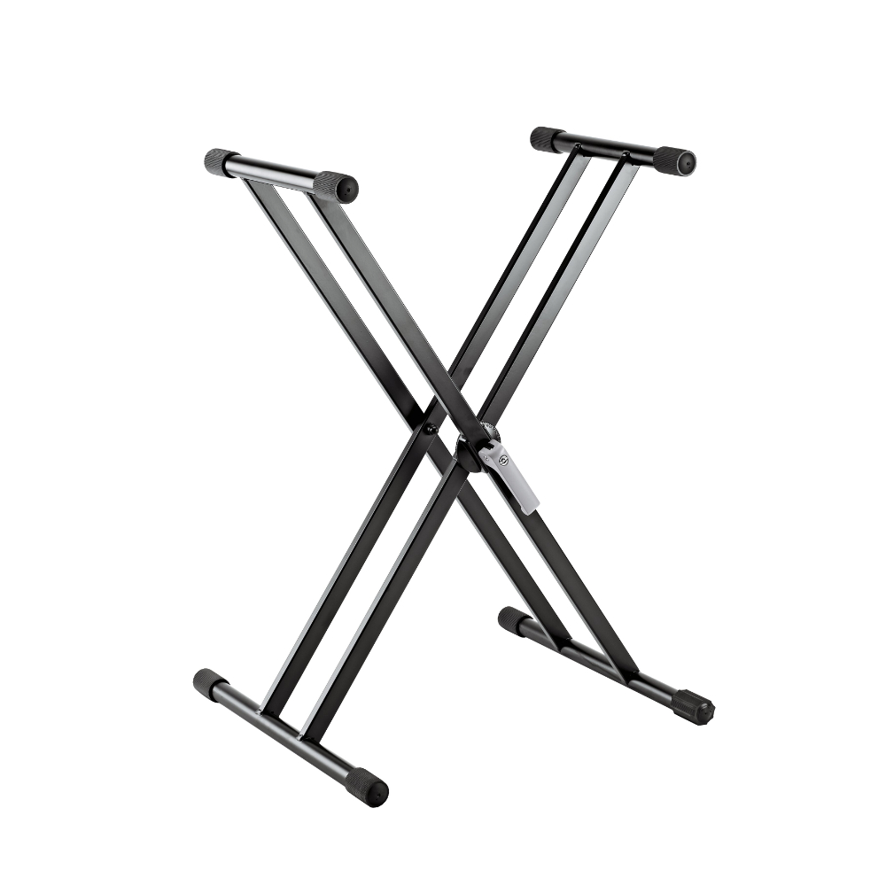 Lo stand a X in alluminio K&M è leggero ma estremamente stabile grazie ai tubi a doppia traversa. Offre regolazione a 5° con scala di riferimento, profondità massima di 350 mm e piedini in gomma regolabili per ogni superficie. Le estremità posteriori scorrevoli si adattano alla larghezza della tastiera. Compatibile con l’accessorio 18941 per aggiungere un secondo piano.