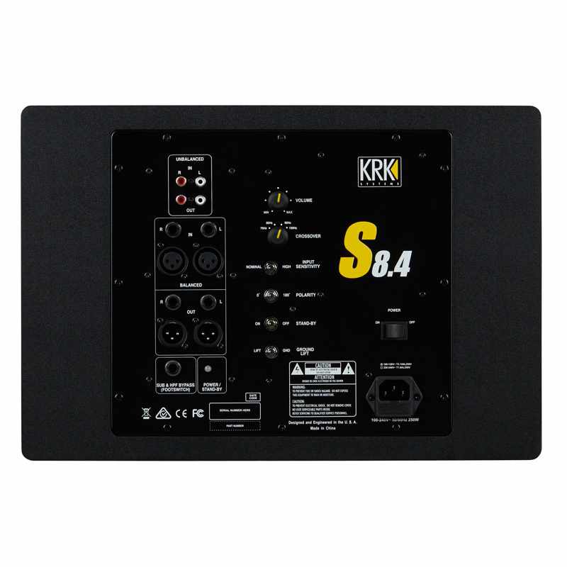 Subwoofer KRK S8.4 perfetto per essere accoppiato a due monitor per l’ascolto in studio. Controllo remoto per il bypass per attivare o disattivare velocemente il sub durante l’ascolto e il mixing. Woofer da 8″ in composito e amplificazione in Classe D da 109W.