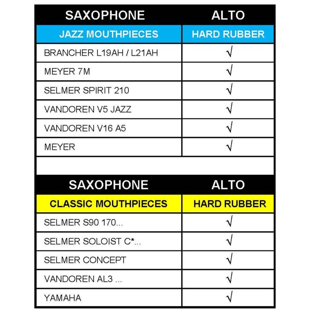 Legatura in tessuto munita di placca in metallo argentato. Fornisce un tono chiaro/brillante per il sassofonista contralto.