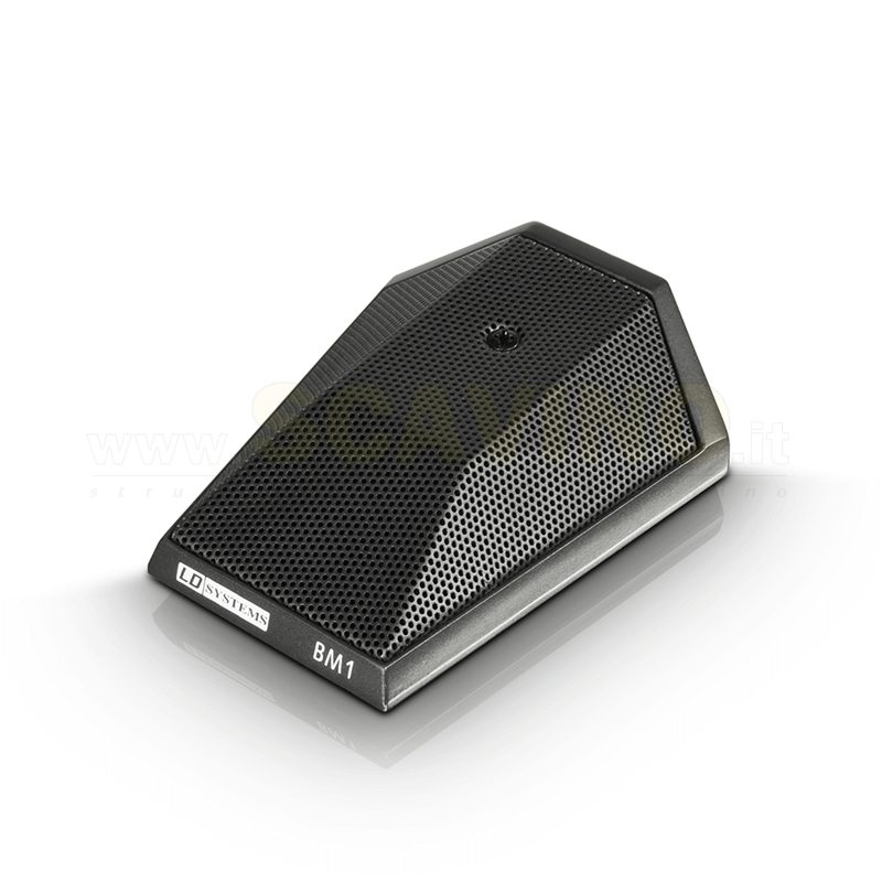 BOUNDARY-STRATO MICROFONO Il LD Systems BM1 è un microfono a condensatore boundary con una caratteristica direzionale emisferica. Ottimo per microfonazione di pianoforti verticali e a coda sul palco o in studio. Ottimo per applicazioni nel settore conferenza e per la trasmissione di spettacoli teatrali.