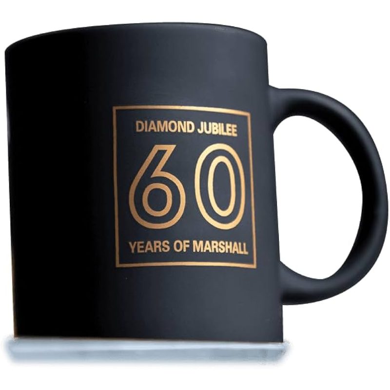 La 60th Anniversary Mug è la tazza che celebra i 60 anni di Marshall.PANORAMICAQuesta tazza presenta una finitura black matte con stampe in colorazione metallic gold. Mostra il logo Marshall, il logo Diamond Annviersary e ha un interno lucido.