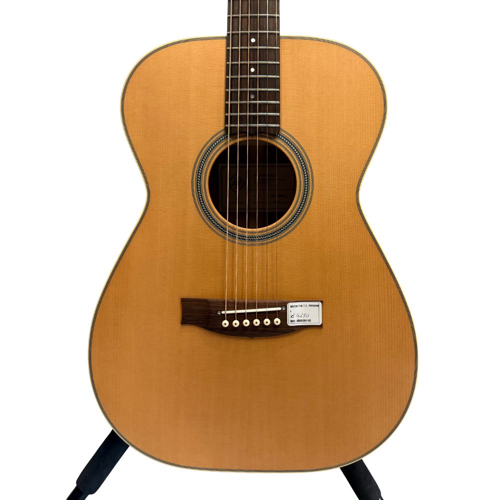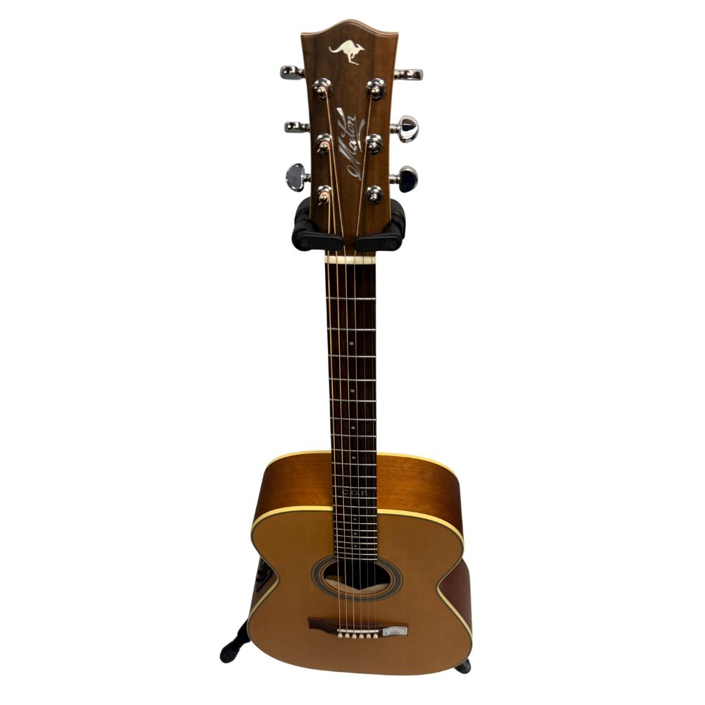 Made i Australia – “AAA” Grade Spruce Top – Figured Queensland Maple Back and Sides – Mahogany Neck – Rosewood Fingerboard and Bridge – Scalloped Maton X (Sitka) Bracing – Jescar FW43080 Fretwire – 21 Frets – Chrome Grover Rotomatic Machine Heads – Original Hard Case
