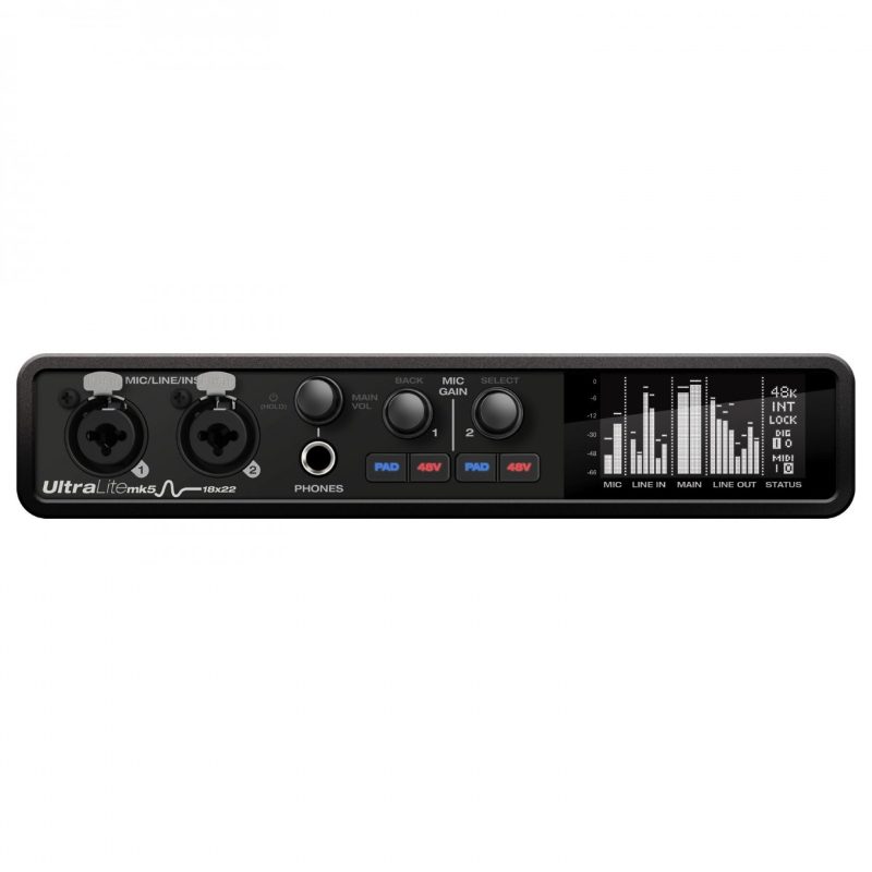 Come i suoi predecessori, l’UltraLite-mk5 racchiude un grande numero di canali per un’interfaccia di dimensioni desktop. Il totale di 40 canali I/O simultanei include due ingressi XLR/TRS combo microfono/linea/Hi-Z sul pannello frontale con preamplificatori (+74dB di gain), 6 ingressi di linea analogici, 10 uscite di linea analogiche bilanciate su jack da 1/4” (comprese le uscite monitor principali), ingresso ottico ADAT a 8 canali (commutabile in stereo TOSLink – S/PDIF coassiale), I/O stereo RCA e S/PDIF e jack di ingresso / uscita MIDI. Il routing del segnale è gestito dal software CueMix 5 incluso, che è stato riprogettato come app nativa per macOS, Windows e iOS. Consente di creare monitor mix indipendenti per le uscite analogiche con effetti (EQ a 4 bande, gate, compressore, riverbero) gestiti dal DSP integrato dell’interfaccia.