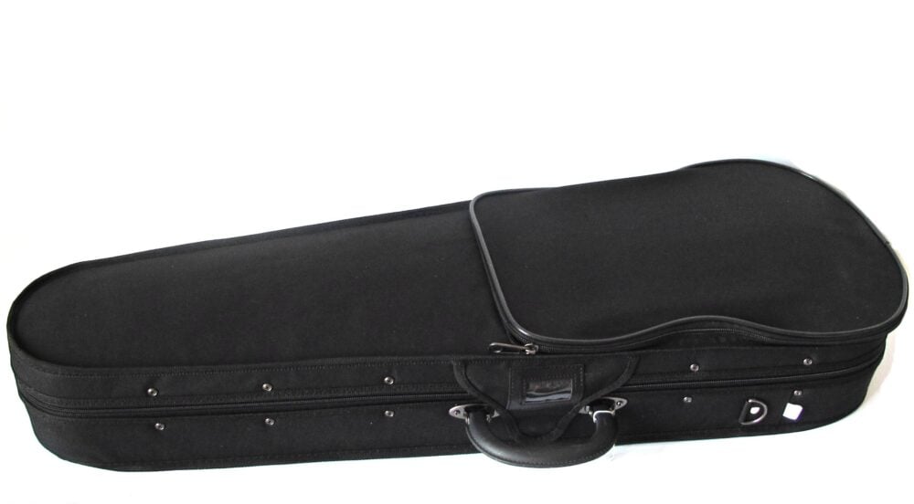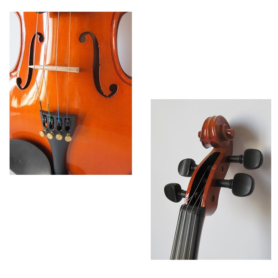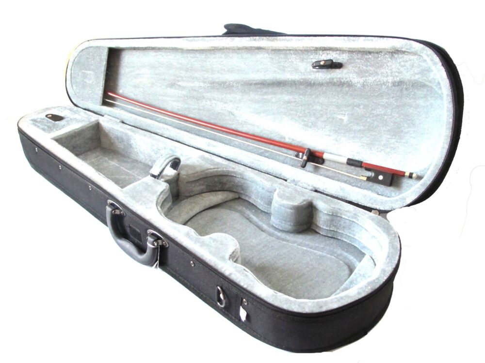 Completamente in legno laminato, completo di custodia rigida con rivestimento in velluto, arco con bacchetta ottagonale ed occhio di pernice parigino, colofonia. Violino da studio Bruck.