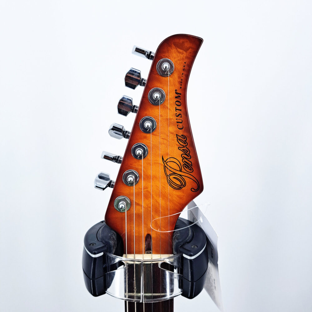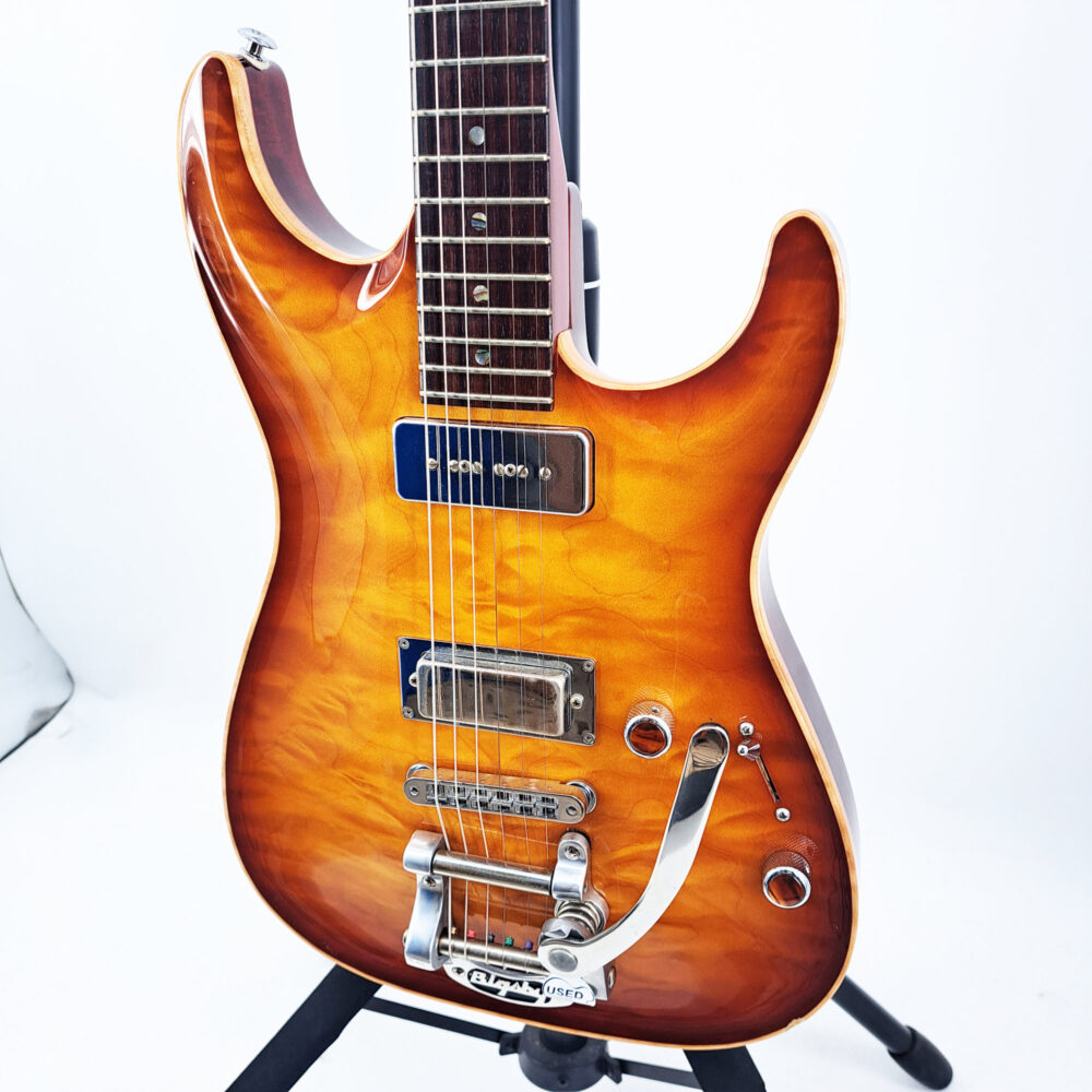 USA – Custom hand made guitar by Rudy Pensa Himself Mahogany body – Quilted Maple top – Mahogany bolt on neck Rosewood fingerboard – original Bigsby – DiMarzio mini Humbucker on bridge – Lindy Fralin P90 on neck Spertzel locking machine heads – with original hard case – excellent condition except for a little dent