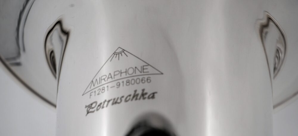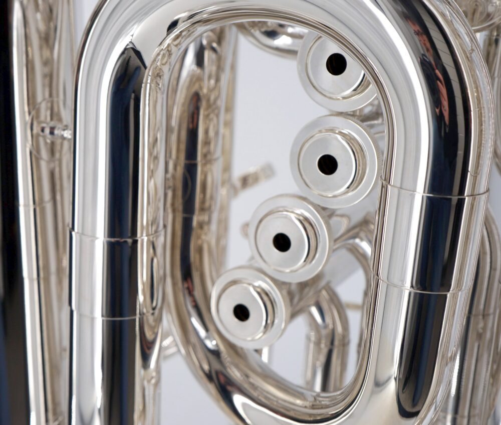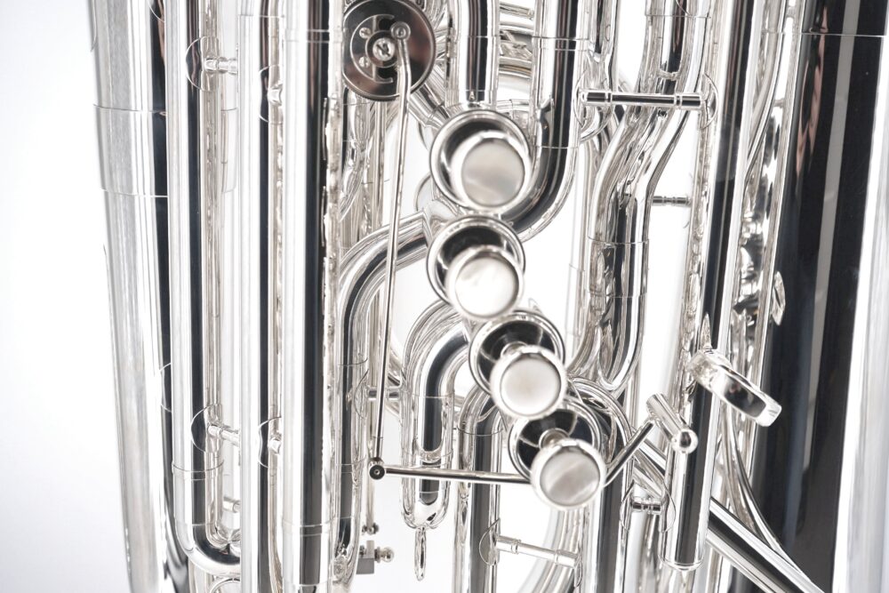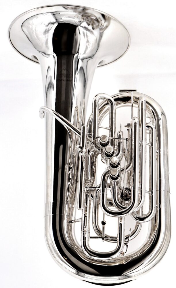 Tuba in Fa modello petruska dimensioni 5/4 con campana da 420mm, in ottone finitura argentata con 4 pistoni frontali e 5° a cilindro.