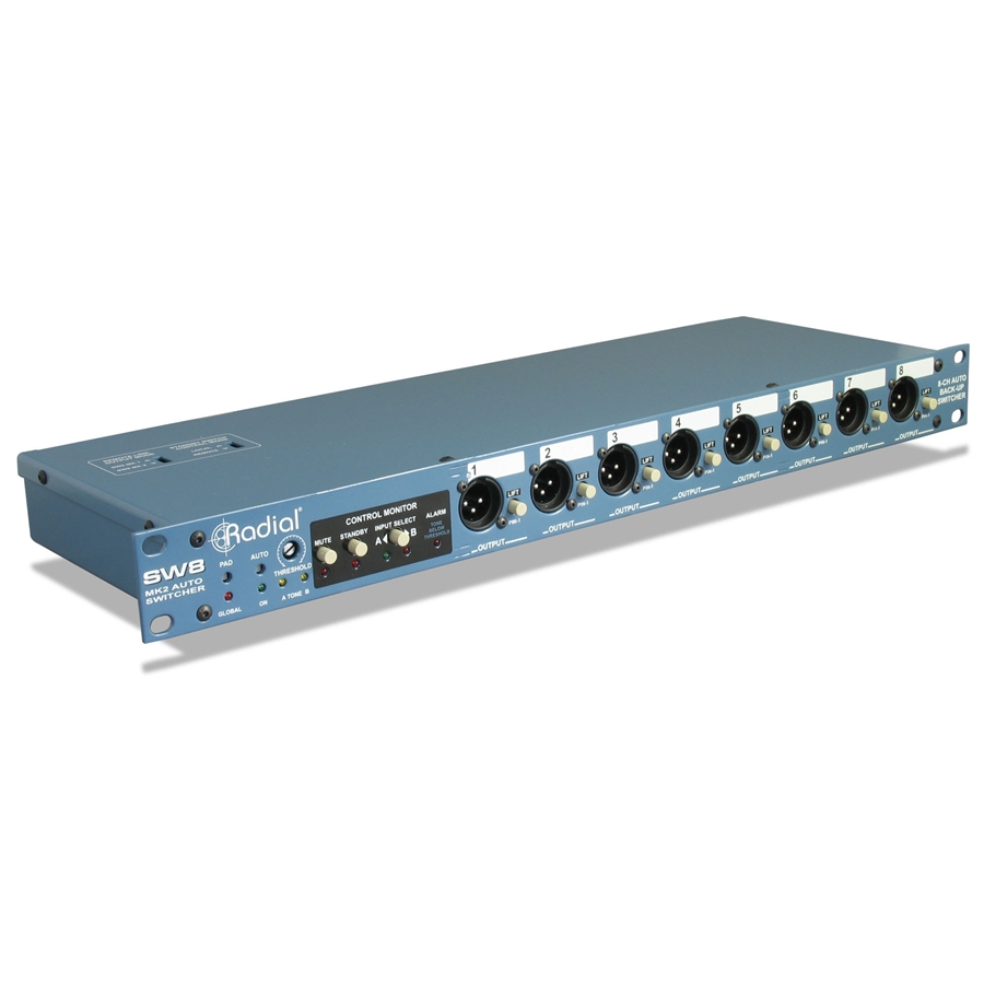 Radial SW8 è un auto-switcher a 8 canali che consente di impostare un sistema di backup ridondante con la commutazione automatica tra due fonti, come ad esempio due registratori digitali, computer o sistemi di rete. Progettato soprattutto per concerti dal vivo e spettacoli teatrali in cui si utilizzano basi per sezioni orchestrali, voci ed effetti sonori, SW8 impiega un gate regolabile che rileva il malfunzionamento della macchina e passa a una seconda macchina ‘backup’ garantendo prestazioni senza problemi. Il dispositivo si limita a rilevare il funzionamento a regime di un segnale su una pista e lo immette in SW8. Se il segnale cade, SW8 passa automaticamente al sistema B e fa ‘suonare’ un allarme. La commutazione può essere effettuata anche manualmente tramite l’interruttore A ~ B sul pannello frontale, un interruttore latching ad accesso posteriore o utilizzando il pedale opzionale Radial JR2. Per configurazioni più grandi, è possibile collegare insieme più SW8 creando sistemi a 16, 24 o 32 tracce.