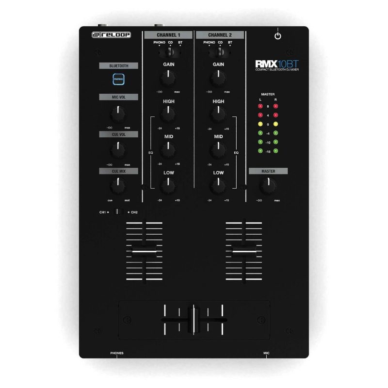 L’RMX-10 BT è un mixer DJ compatto a 2 canali, che facilita lo streaming di musica wireless direttamente sul mixer tramite l’interfaccia Bluetooth integrata. In questo modo è possibile utilizzare uno smartphone o un tablet come sorgente per la riproduzione audio e instradare il segnale attraverso il mixer. Il segnale Bluetooth può essere indirizzato a entrambi i canali. Inoltre, il crossfader da 45mm è sostituibile dall’utente ed i line fader fluidi rendono il mixaggio più confortevole. Ogni canale ha un controllo del guadagno indipendente e un equalizzatore a 3 bande che incrementa o taglia le frequenze a 100Hz, 1kHz e 10 kHz. L’RMX-10 BT ha un ingresso per microfono da 6,3mm con regolazione del volume separata, nonché un’uscita per cuffie da 6,3mm con regolazione del volume e funzione cue-mix. Il volume di uscita principale può essere monitorato tramite catene di livelli a LED. La costruzione salva-spazio e robusta è in metallo.