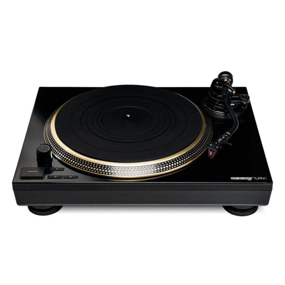 Reloop HiFi presenta TURN 5, un giradischi con motore a trazione diretta e controllo della velocità al quarzo, che soddisfa i più elevati standard sonori del mondo hi-fi. Il motore a corrente continua senza spazzole garantisce una trazione potente e una rotazione costante. Il piatto in alluminio pressofuso dispone di uno strato di gomma fonoassorbente nella parte posteriore, che unitamente al tappetino in gomma spesso 5 mm, previene risonanze e vibrazioni indesiderate per una riproduzione sonora eccezionale.