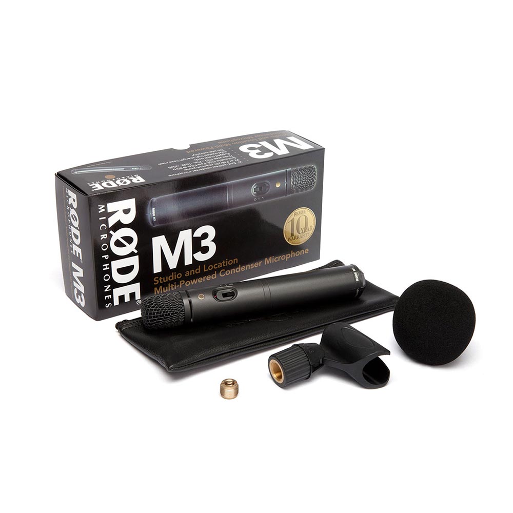 Il RØDE M3 è un microfono a condensatore a ripresa frontale molto versatile, progettato per adattarsi perfettamente a casa, in studio, sul palco o per la registrazione mobile. È ugualmente adatto alla ripresa di chitarre, batteria, percussioni e anche voci. Con una struttura completamente metallica e una capsula a condensatore da 1/2” a ripresa frontale e montata su di un supporto elastico interno, l’M3 può essere alimentato sia con alimentazione phantom P48 che con una batteria interna da 9V. Un attenuatore di livello di –10dB e –20dB (pad), controllabile dall’interno del vano batteria, permette la registrazione di sorgenti sonore molto forti, come amplificatori per chitarra o rullanti. Un filtro passa alto inseribile tramite l’interruttore di accensione attiva un filtro a 80Hz per attenuare le componenti a bassa frequenza ed il rumore da maneggiamento. Il RØDE M3 è progettato e costruito in Australia ed è coperto dalla garanzia leader del settore di RØDE Microphones di 10 anni.