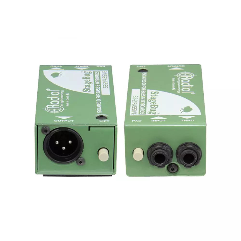 Passive DI for bass, acoustic and keyboard Ultra compact to fit in your guitar case Plug & play easy to use feature set Transformer isolation eliminates noise The Radial StageBug SB-2 Passive is a high-performance direct box made for players who are on the move! Made to fit inside of a guitar case, the SB-2 is ultra compact yet is feature-packed to ensure great performance on any stage. The compact design begins with a ¼” input and thru-put to feed the on-stage amp. This connects to the custom made Eclipse ET-DB3 transformer which performs the impedance matching and balances the signal. When using extra high output instruments, a -15dB pad can be inserted into the signal path. This enables the SB-2 to be used with active basses and digital pianos that often tend to overload the input side of the interface. An innovative stereo-to-mono merge function provides a convenient way to connect stereo keyboards and computers without having to reset the source for mono operation, saving time and input channels on the PA. The SB-2 output features an XLR wired to the AES standard with pin-2 hot. Once connected, the SB-2 delivers a smooth warm sound reminiscent of older vintage gear. The Eclipse ET-DB3 transformer is magical in its ability to handle extreme signal levels with a natural compression that is pleasing to the ears. The transformer also helps eliminate hum and buzz caused by ground loops by isolating the input from the output. This is augmented with a ground lift switch that lifts pin-1 on the XLR for quiet, professional results. These features make the StageBug SB-2 a great choice for electric bass, acoustic guitar and keyboards where small size and big performance matters!