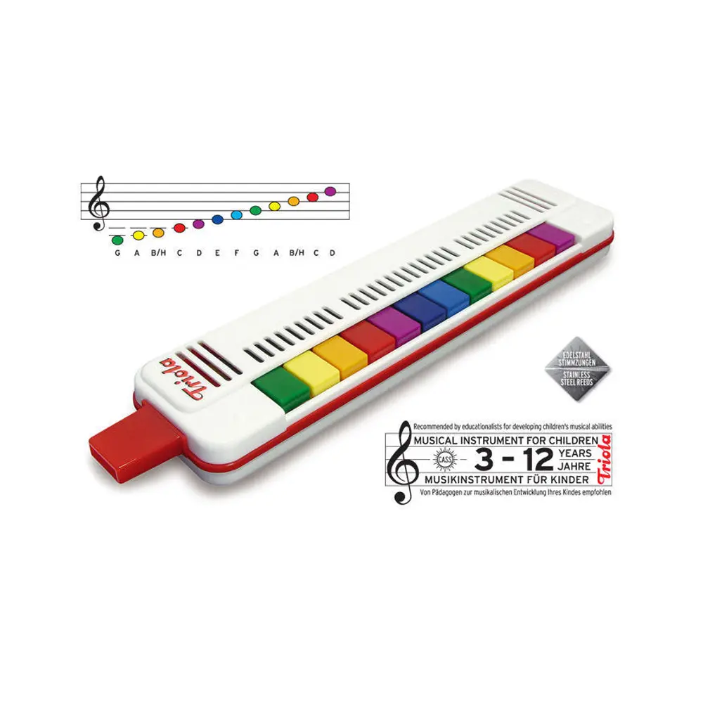 Prodotto in Germania: la Triola è prodotta da C.A. SEYDEL Söhne GmbH a Klingenthal (Sassonia). L’azienda ha più di 170 anni di esperienza nella costruzione di strumenti musicali. La Triola è un’armonica a bocca per bambini di età compresa tra 3 e 12 anni, con cui fare musica è facile e molto divertente! Con la Triola puoi suonare note singole e persino accordi interi.