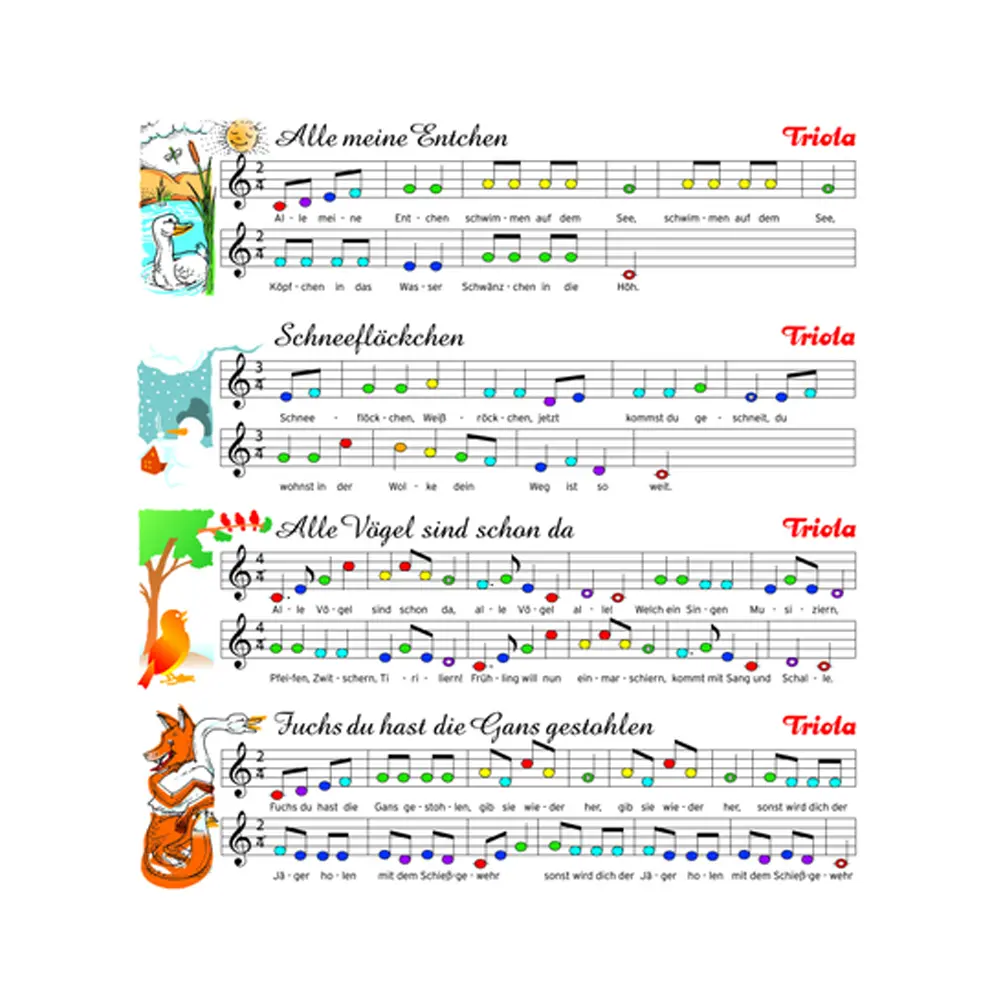 La Triola è un vero strumento musicale. Tutte le note sono accordate con precisione. L’estensione va da sol’ a re”’ e segue la scala di Do maggiore (vedi anche in “Suggerimenti”). Incluse istruzioni di esecuzione con le prime quattro canzoni per un facile inizio. Molti altri libri di canzoni e un dettagliato libro didattico sono disponibili separatamente.