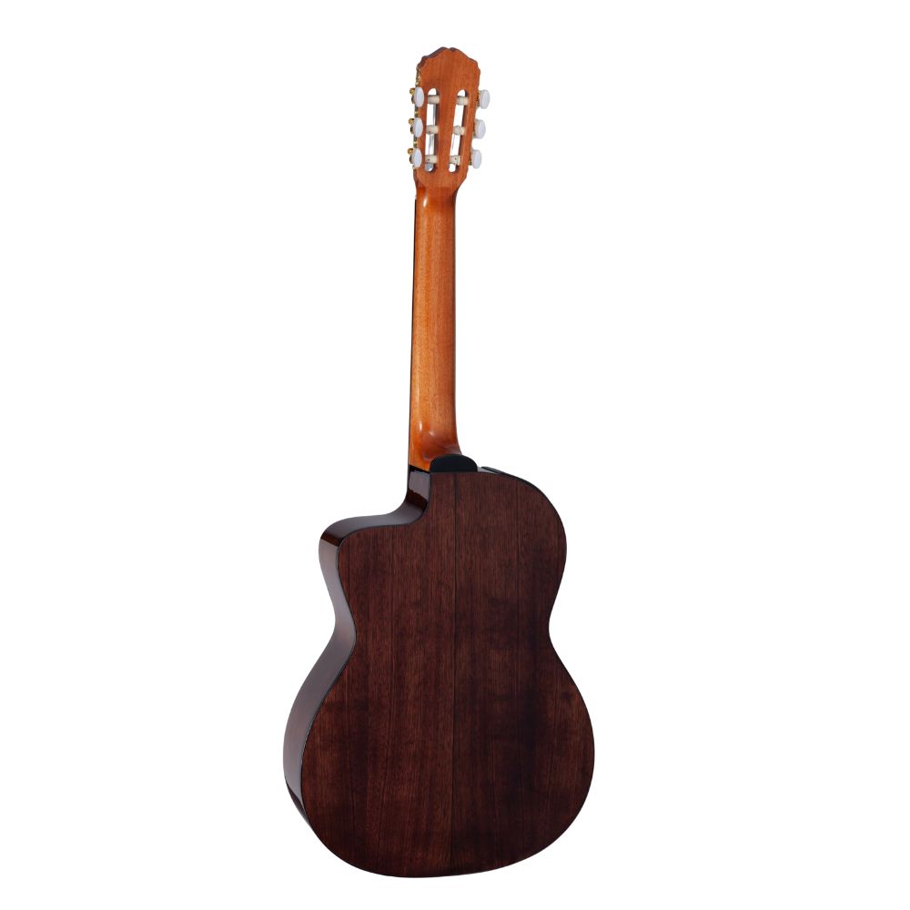 Chitarra classica Takamine con top in abete massello, fasce e fondo in noce e manico in mogano, offre un suono chiaro e potente grazie alla buca ovale e al sistema di rinforzo a ventaglio. La scala da 650 mm e il preamp TP-4T con accordatore integrato la rendono ideale per il palco. Finitura naturale lucida e corpo classico per un timbro autentico e bilanciato.
