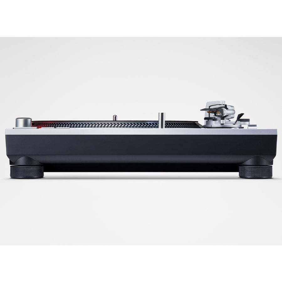 Giradischi TECHNICS SL-1200 MK7 Silver a trazione diretta con motore coreless. Il sistema a trazione diretta utilizza un motore a rotazione lenta per azionare direttamente il piatto. Questo sistema offre diversi vantaggi. Garantisce prestazioni elevate, precisione di rotazione e potente coppia, non richiede la sostituzione di componenti e assicura un’elevata affidabilità per lungo tempo. D’altra parte, sembrava che il sistema a trazione diretta producesse un’irregolarità della rotazione definita cogging. Per il modello SL-1200MK7, è stato sviluppato un nuovo motore a trazione diretta coreless che impiega uno statore privo di nucleo. La rimozione del nucleo (nucleo in ferro) dallo statore ha annullato la causa principale del cogging. Inoltre, la forza magnetica dei magneti del rotore è stata migliorata al massimo livello possibile e lo spazio tra lo statore privo di nucleo e i magneti è stato ottimizzato, ottenendo così prestazioni di coppia elevata. Grazie a una rotazione fluida e a una coppia potente, questo motore riproduce il suono in modo accurato e fedele dal solco di un disco analogico.