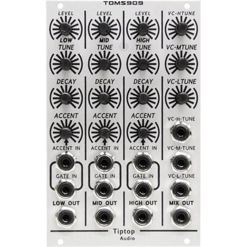 Il TIP TOP AUDIO TOMS909 TR909 VC ANALOG TOMS GENERATOR è un modulo a quattro suoni che replica la timbrica dei TOM della batteria elettronica Roland TR-909 adattandola al mondo Eurorack e offrendo parametri di controllo aggiuntivi mantenendo integra la timbrica storica della 909. Larghezza 16 HP.