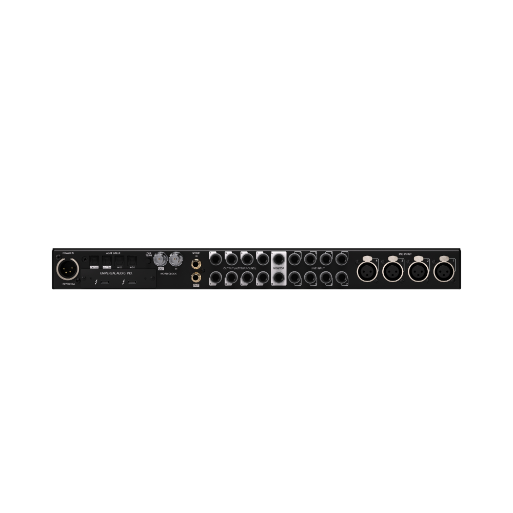 - 4 preamplificatori Unison™, 2 ingressi Hi-Z, 8 ingressi linea 1/4″, 2 I/O ottici Toslink (ADAT S/MUX), I/O RCA (S/PDIF), I/O word clock (BNC)